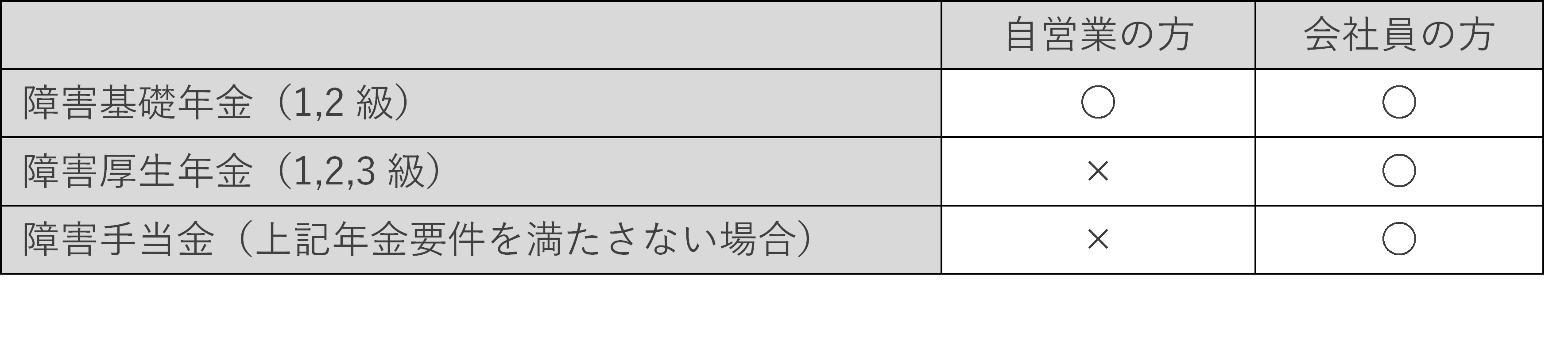 自営業者の方は、障害基礎年金しか受け取れません。会社員の方は、障害厚生年金に加えて、3級に満たないまでも障害が残れば一時金として障害手当金が支給されます。