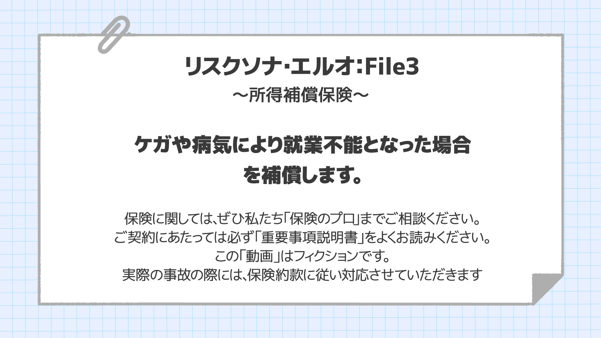<p>みなさんの周りにもこんな人1人はいないでしょうか?リスクに備えすぎの「リスクソナ・エルオ君」が奇想天外な方法で「ケガ・病気による就業不能」に備えるも・・・</p>
